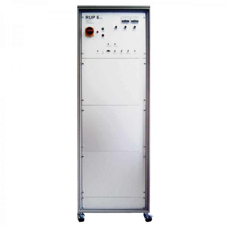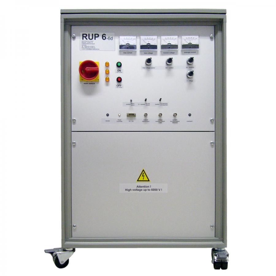 Depending on the design, the RUP6 consists of many cascaded 1kV IGBT half-bridge pulse modules which are connected in parallel for charging and connected in series for the pulse itself. This requires only a 1kV primary power supply. Modulator and power supply are inseparably integrated into one another in this principle. The pulse width is almost freely selectable and is limited only by the stored energy. The pulse generators of the RUP6 series, typically, provide negative output voltages.